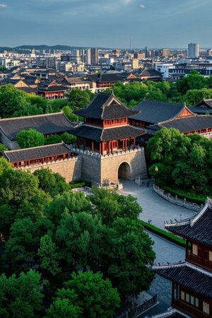 Overlooking Chinese ancient buildings and city scenery