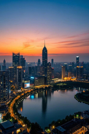 Panoramic view of the city lake and high rise buildings at dusk