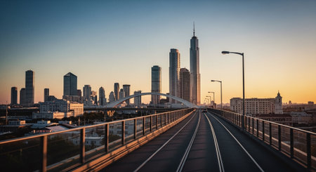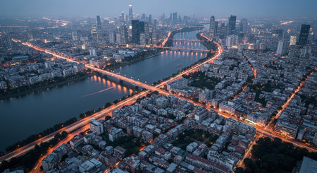 Busy metropolitan cityscape at dusk with skyline illuminated AI generated