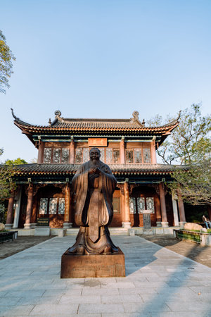 Bronze statue of ancient scholar stands before traditional Chinese temple under clear sky