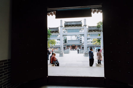 Traditional Chinese temple gate view with visitors walking through courtyard under stone archways