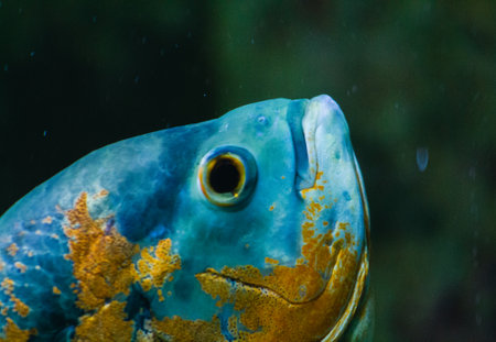 A fish with a blue and yellow pattern on its face. The fish is looking at the camera