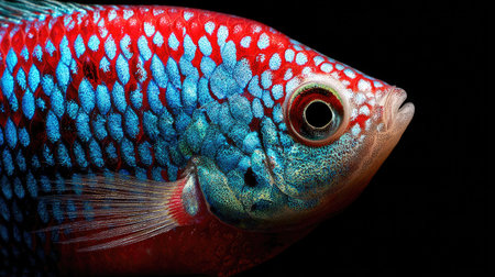 This close-up showcases a brightly colored tropical fish with a mix of blue and red scales. The detailed image highlights the fish's eye and fins against a dark background, emphasizing its vivid colors and patterns. Suitable for commercial and editorial purposes, the photograph suggests a natural aquatic environment.