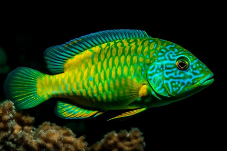 Close-up on green fish at the bottom of the sea. Generative AI