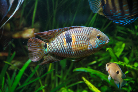 Cichlid fish swimming in the aquarium. Tropical fish.