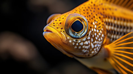 A close up of a yellow fish with big eyes and black background, AI