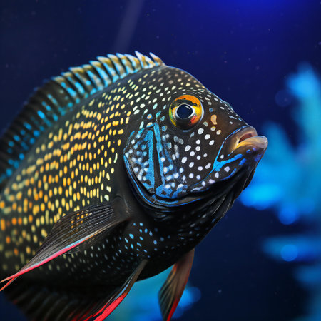 Akara fish blue with a dark background.