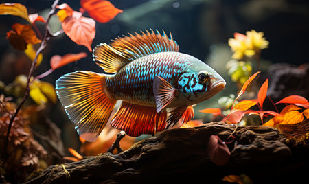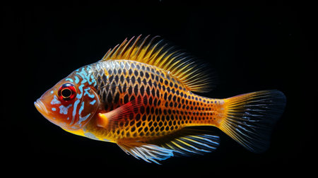 A stunning, brightly colored cichlid fish, showcasing its iridescent scales and intricate patterns. This aquatic creature is presented in a detailed, close-up view, perfect for showcasing its natural beauty and vibrant hues.