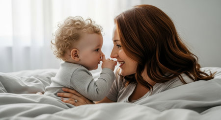 Loving mother with auburn wavy hair and her infant son with light blonde curly hair share a tender moment, lying together on a soft, pale grey duvet, expressing joy and connection.