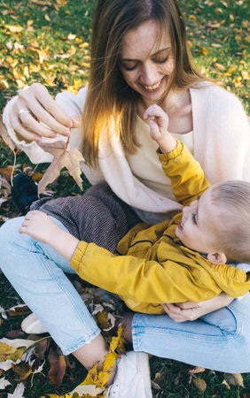 Mom and son in the autumn park. happy faces. Special processing of lifestyle images. Sitting on the grass and yellowed leaves. Happy moments.