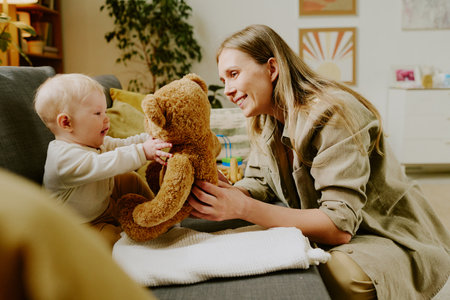 Mother engaging baby with teddy bear while sitting on couch in cozy living room creating warm and joyful atmosphere