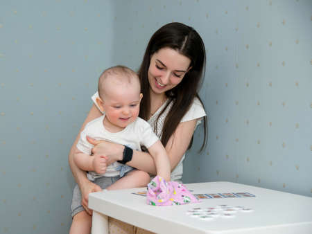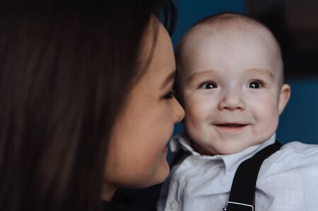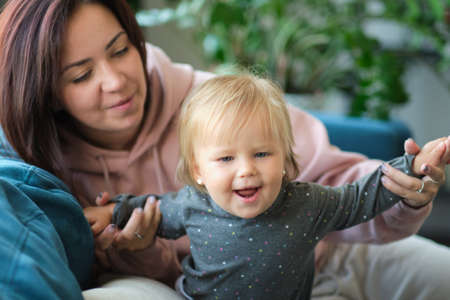 Mother is playing with her son. The baby is laughing. The concept of communication between parents and children, entertainment in quarantine, stay home.
