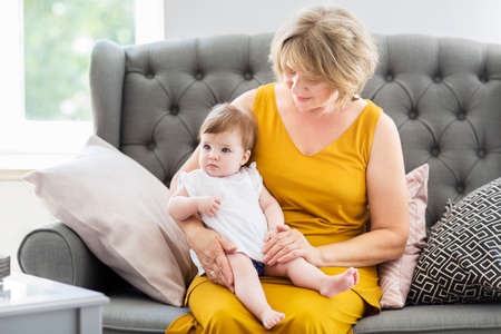 Mature woman embrace with baby girl. Grandmother and girl