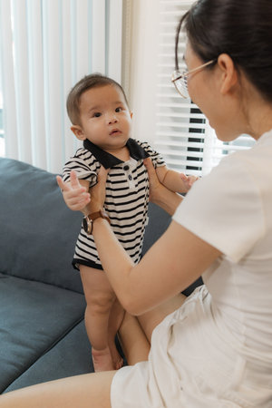 A mother lovingly interacts with her baby while lying on the sofa, creating a warm and tender bonding moment that reflects affection, nurturing, and the beauty of family connection.