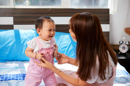 Mother talking to crying baby