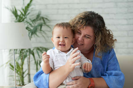 Portrait of happy loving plus sive woman hugging her adorable mixed-race baby boy