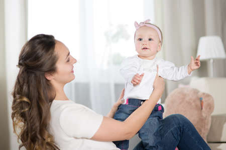 Happy mother with adorable girl toddler at home