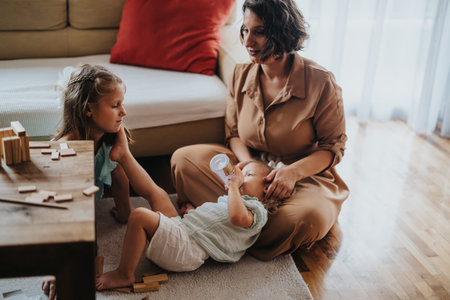 Mother playing with her cute baby, while little child resting on her laps