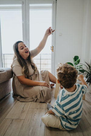 Pregnant mother and young child playing together with wooden balance toy at home