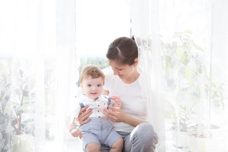 Happy family. mother and her cute son sitting on the sofa near the window