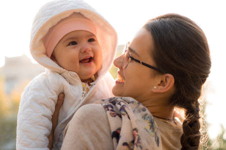 infants, childhood, motherhood, family, lifestyle concept - happy young mom in glasses hold fat chubby newborn smiling baby girl 6 months old in white jacket outdoors against backdrop of bright sun.