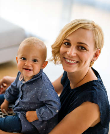 Mother holding baby smiling to camera. Real life authentic casual mom looking to camera holding