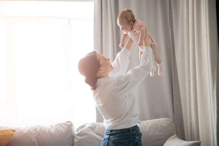 Portrait of young mother and newborn baby in her arms at home, morning exercises for healthy growth of infant, sunlight