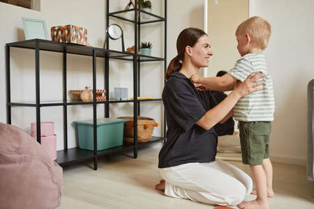 Smiling pregnant young mother sitting on floor and talking to preschool son at home