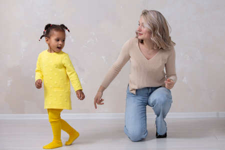 Multiethnic mom and daughter play at home. Cheerful mother with little daughter of African nationality. Family from different races.