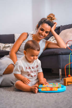 Young Caucasian mother with her son sitting on the floor next to the black sofa. Teleworking and caring for your child, a new normal after the coronavirus pandemic, covid-19. Watching the child play