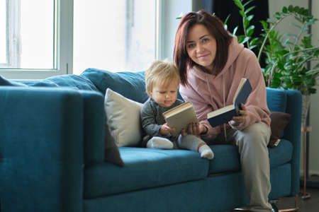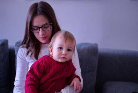 Mother reading a book the baby in sofa. before going to sleep. taking care of children. mothers love for her daughter