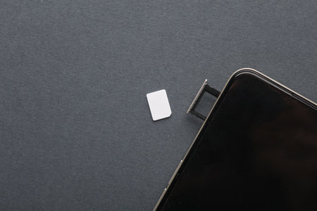 Smartphone and tray with SIM card on a gray background. Flat lay