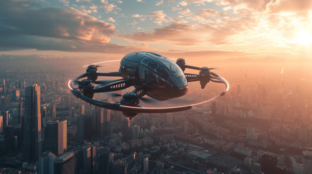 A futuristic drone taxi hovers gracefully above a bustling urban landscape. Its advanced design highlights innovation, aiming to redefine the way people travel in cities