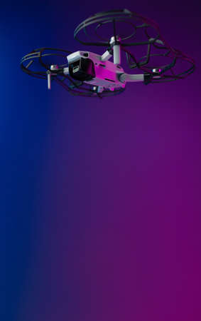 The smallest drone. unmanned aerial vehicle with blade protection and camera in flight in neon light . Russia