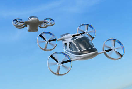 Metallic gray Passenger Drone Taxis flying in the sky. 3D rendering image.