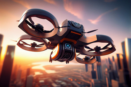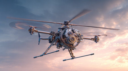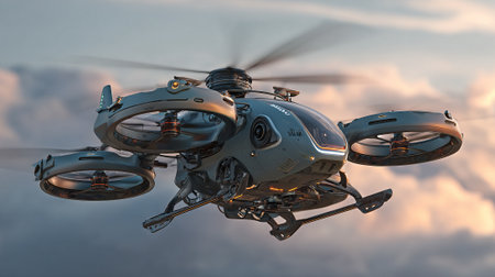 The image features a highly detailed, futuristic drone with rotating propellers, set against a gradient sky. This sophisticated machinery suggests advanced technology and applications in aerial surveillance and delivery systems.