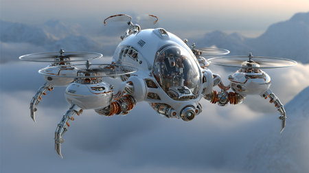 An artistic depiction of a futuristic flying machine, rendered in a steampunk style, hovers against a backdrop of cloudy mountain peaks. It has rotors, a transparent cockpit, and articulated legs.