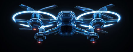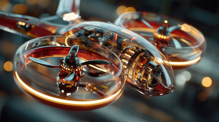 A stunning close-up of a futuristic drone featuring a transparent body and illuminated components. The modern design highlights technological innovation and aerial capabilities.