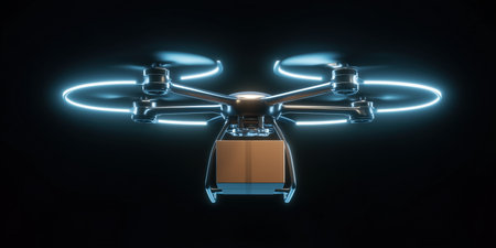 Delivery drone with glowing lights in dark background. Innovation in modern logistics.