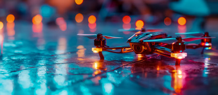 Illuminated racing drone on a reflective surface at dusk, conveying modern technology and entertainment