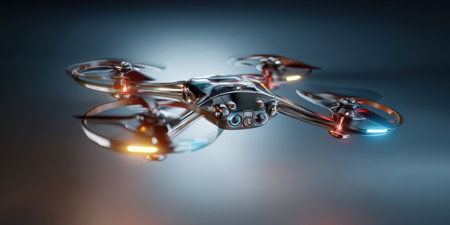A sleek, metallic drone hovers in a dimly lit environment, its propellers spinning softly. Colorful lights illuminate the drone's body, showcasing its modern design and technology.