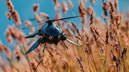 The image showcases a futuristic, highly detailed, metallic drone resembling a helicopter. The intricate design is set against a blurred light blue sky, suggesting a modern aerial vehicle or concept.