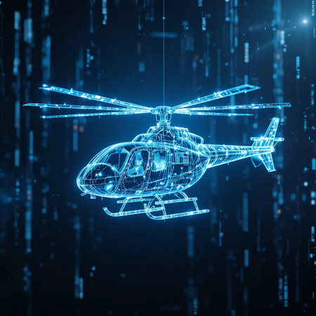 Blue hologram of a helicopter on a dark background. 3d rendering