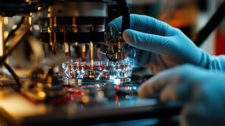 Scientist carefully placing samples on a microchip in advanced laboratory