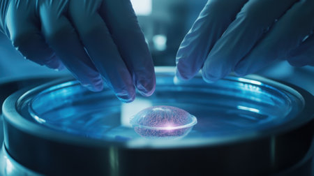 Cornea transplantation. A medical professional showcases a preserved cornea, highlighting the breakthroughs in vision restoration.