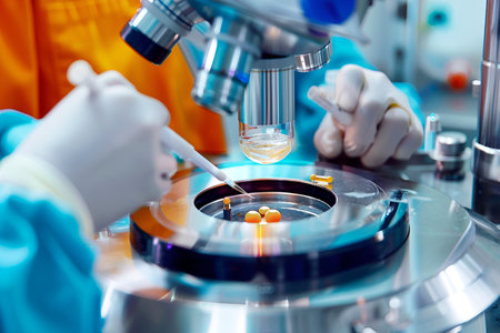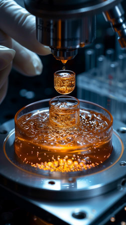 A closeup of a skilled researchers hands using a pipette to precisely transfer stem cell solutions into a of transparent vials labeled for spinal regeneration studies with a focuse
