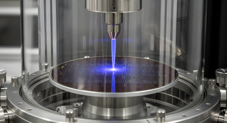Inside a vacuum chamber, a high-precision laser etches intricate circuits onto a silicon wafer. This close-up image showcases the advanced process of semiconductor manufacturing, a cornerstone of modern technology.