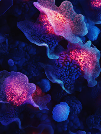 This captivating visualization showcases cancer cells with glowing edges, revealing intricate details and structures in vibrant hues and patterns.