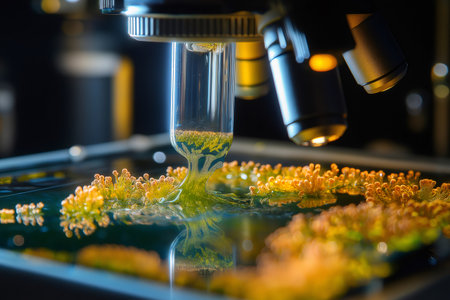 Algae sample being analyzed under a microscope in a laboratory setting, showcasing scientific research and analysis
