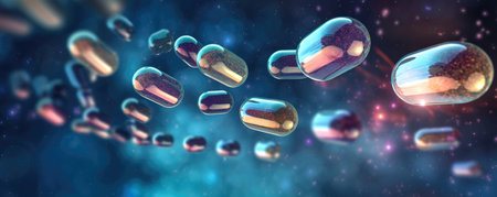 Pharmaceutical capsules floating in abstract space, illustrating the concept of drug discovery